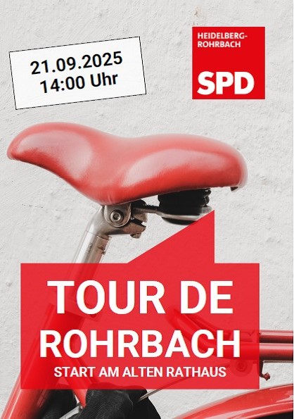 Zur traditionellen Tour de Rohrbach startet die SPD Rohrbach am Sonntag, 21. September. Hierzu sind alle Interessierten eingeladen. Wie immer treffen sich die Teilnehmerinnen und Teilnehmer um 14 Uhr am Alten Rathaus in der Rathausstraße in Rohrbach. Dieses Mal wird die SPD-Wahlkreiskandidatin zur Landtagswahl 2026, Ines Palm, mitradeln und für Fragen zur Verfügung stehen.